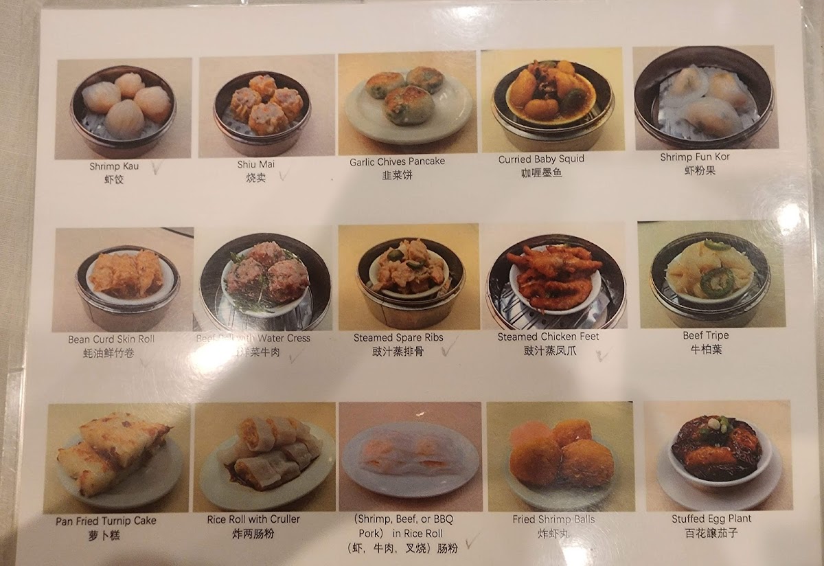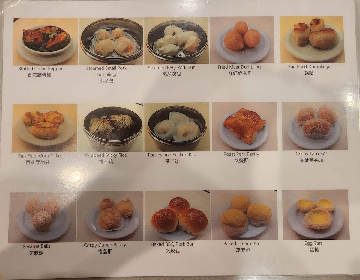 - Dim Sum: Available throughout the day, this section features a range of small plates and bite-sized items such as Spicy Quail Dim Sum, Rice Rolls with Shrimp, Pan-Fried Chive Dumplings, Steamed Chicken Feet, Egg Tarts, Sesame Balls, and Baked BBQ Pork Buns. Dim sum items are often served on traditional carts and are suitable for light meals or sharing.