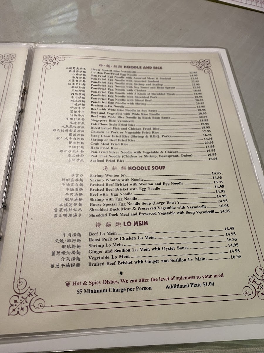 - Noodles and Rice: This category offers several options including House Special Rice Vermicelli, Pan-Fried Egg Noodles with assorted meats and seafood, shrimp and scallop, as well as soy sauce and bean sprouts varieties. These dishes provide both casual and more filling meal choices.